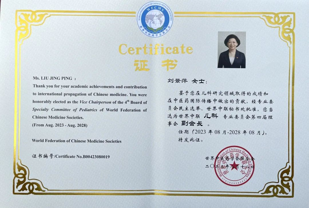 GA黄金甲药业集团党委书记、董事长刘景萍当选世界中医药学会联合会儿科专业委员会第四届理事会副会长