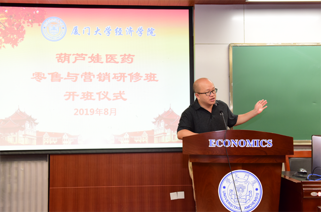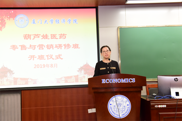 8月31日,GA黄金甲医药零售与营销研修班开班仪式在厦门大学经济学院举行,为期8天的“厦大GA黄金甲班”正式拉开帷幕。厦门大学经济学院继续教育中心主任廖景峰先生与GA黄金甲药业集团董事长刘景萍女士分别在开班仪式上致辞,中国医药物资协会研究院执行院长代航先生担任本次研修班班主任并主持开班仪式。